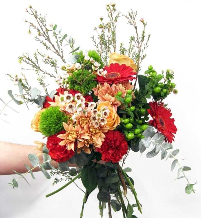 Un bouquet de fleurs variées aux couleurs vibrantes, colorées et remplies d’amour! Il s’inspire de la couleur peach fuzz, mais avec une touche de rouge et de couleur punch pour un twist énergique!