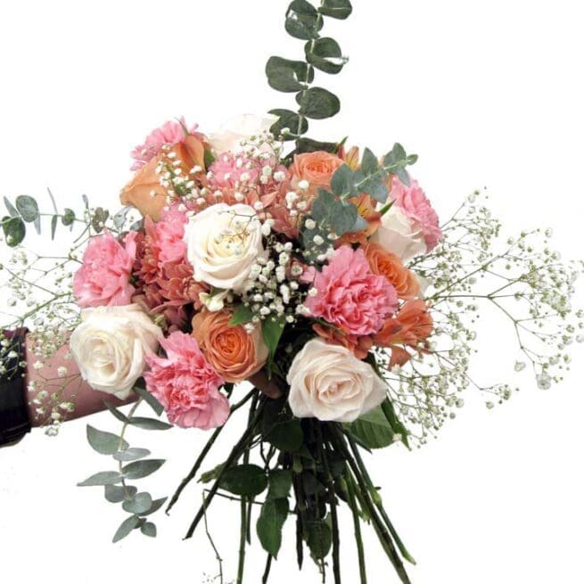 Un bouquet de fleurs variées aux teintes douces de pêche, ivoire, blanc et rose doux. Il s’inspire de la couleur peach fuzz, mais avec une touche de douceur qui fait rêver.