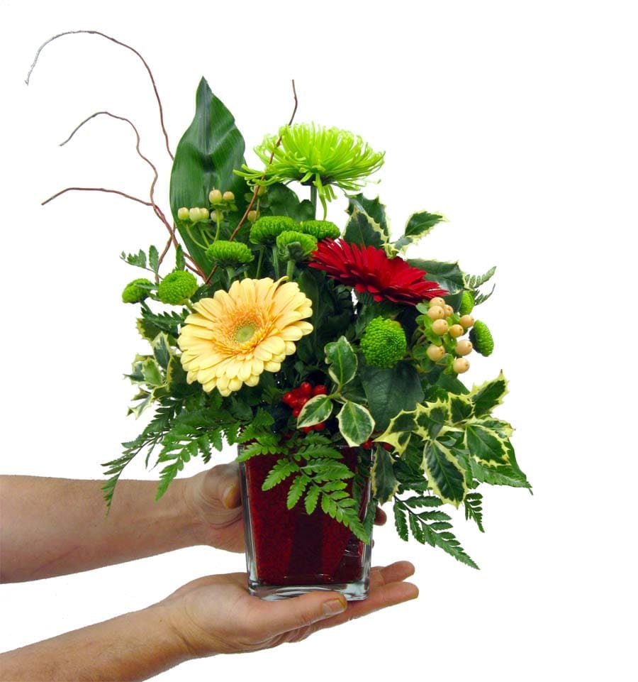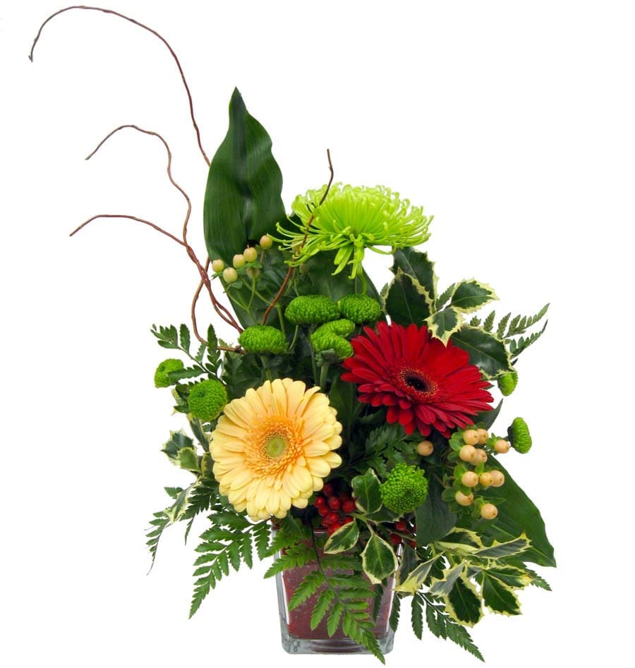 Centre de table festif mais à la fois tout en douceur! Dans les teintes de rouge, vert et pêche, ce classique revisité saura égayer en beauté vos tablées!  Il vous suffit de l’arroser tous les jours, et vous aurez un arrangement qui durera longtemps!