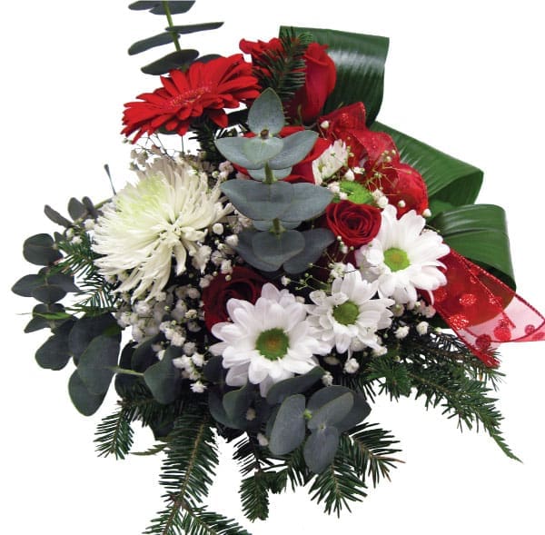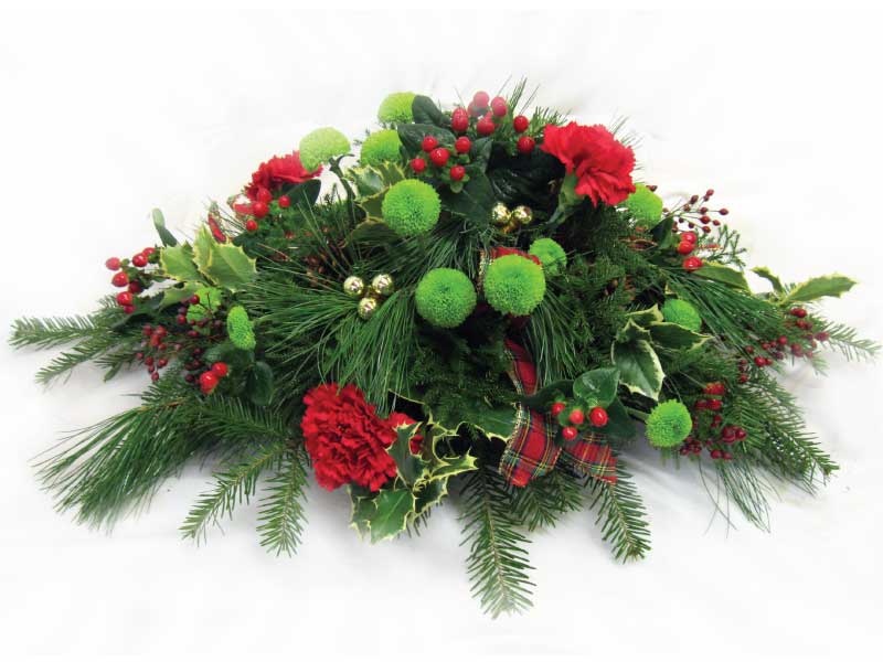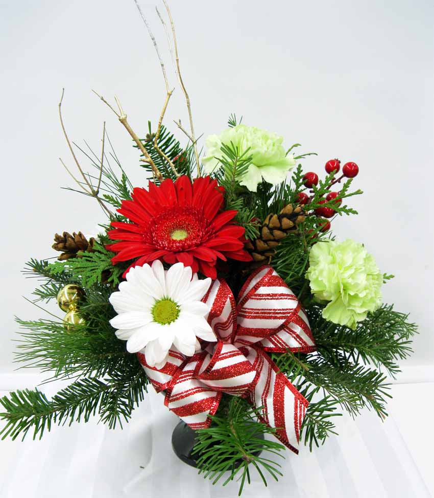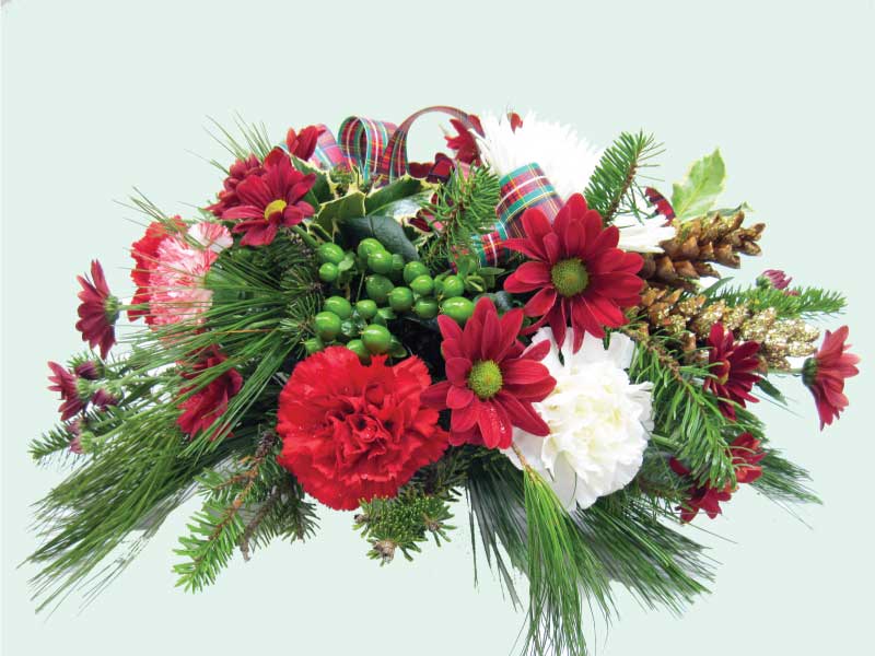 Joli centre de table festif classique comprenant des fleurs variées qui durent longtemps pour vous assurer une table fleurie durant toutes les fêtes!