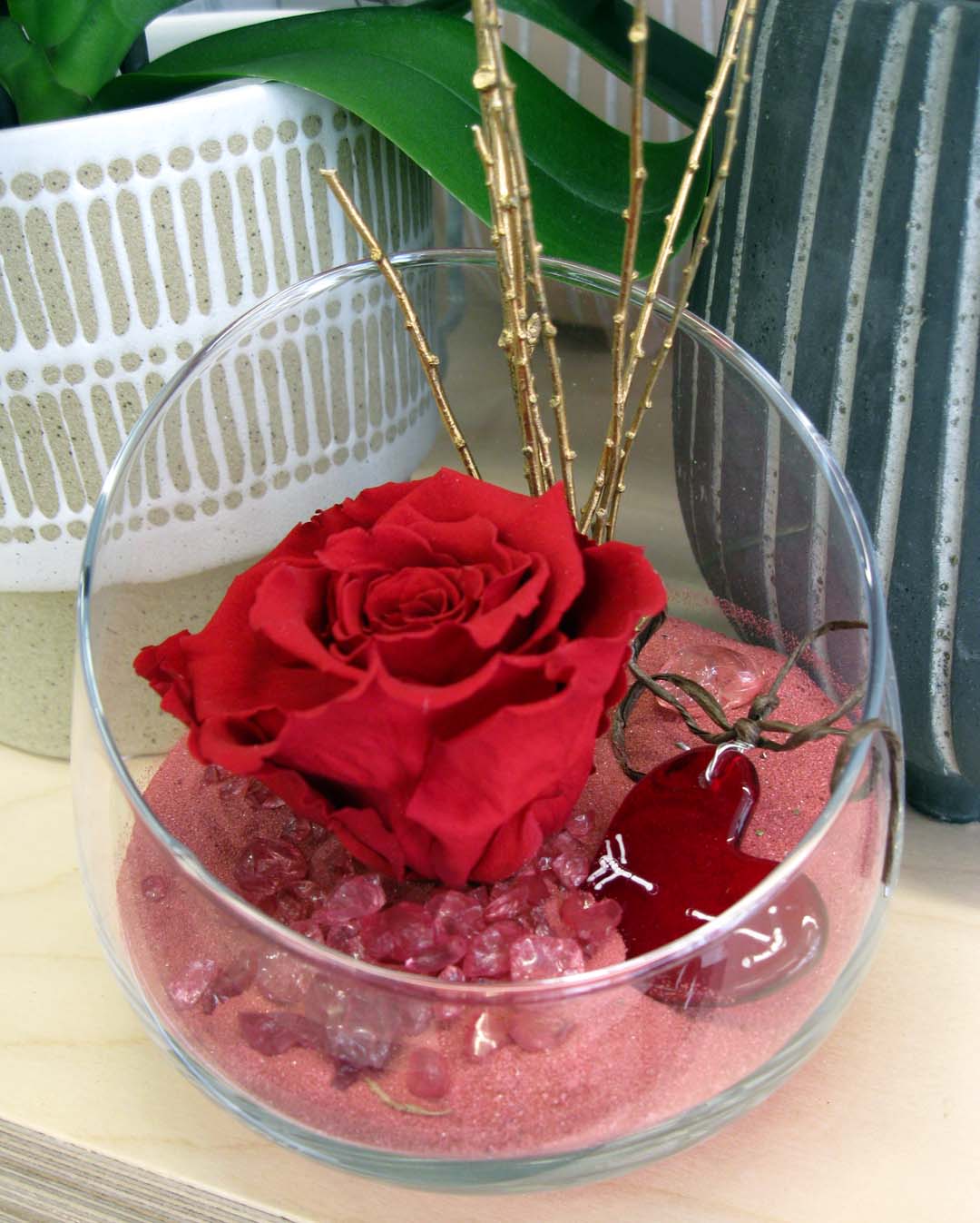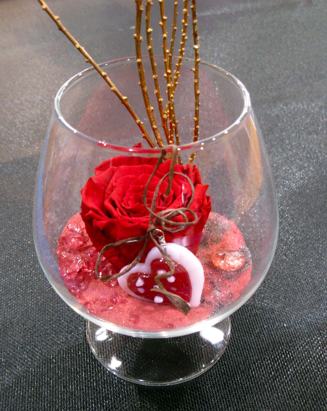Cette jolie rose éternelle rouge est présentée soit dans un petit vase en forme de  »bulle oblique », soit dans une coupe style cognac, accompagnée d’un coeur en vitrail. Il ne vous reste qu’à choisir entre les 2 modèles que nous avons concoctés pour vous!